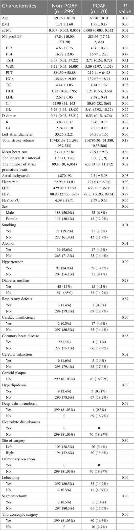A total of 396 patients were included, among which 70 (19%) developed POAF and 299 did not. The two groups showed significant differences in demographic characteristics, comorbidities, cardiopulmonary function, and surgical types (Table 1).