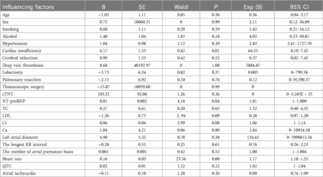 Cohort-wide analysis determined independent risk factors for postoperative AF in lung cancer patients. Univariable screening identified 22 potential predictors linked to AF occurrence (P < 0.05). The risk factors obtained by univariate analysis were included in multivariate Logistic regression analysis to determine the independent risk factors related to postoperative atrial fibrillation in patients with lung cancer (Table 2).