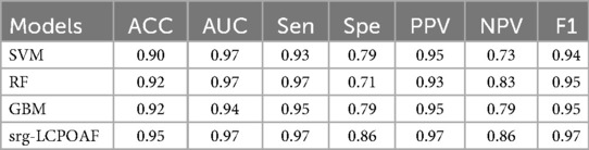 Results showed that the ensemble model srg-LCPOAF outperformed all single models across all metrics, with significant improvements in ACC, specificity (Spe), NPV, and F1 score. RF and GBM exhibited similar performance, though RF had higher sensitivity (Sen = 0.97) and GBM showed better specificity (Spe = 0.79). While SVM demonstrated excellent AUC (0.97), its lower ACC and NPV indicated weaker discriminative ability for negative samples.