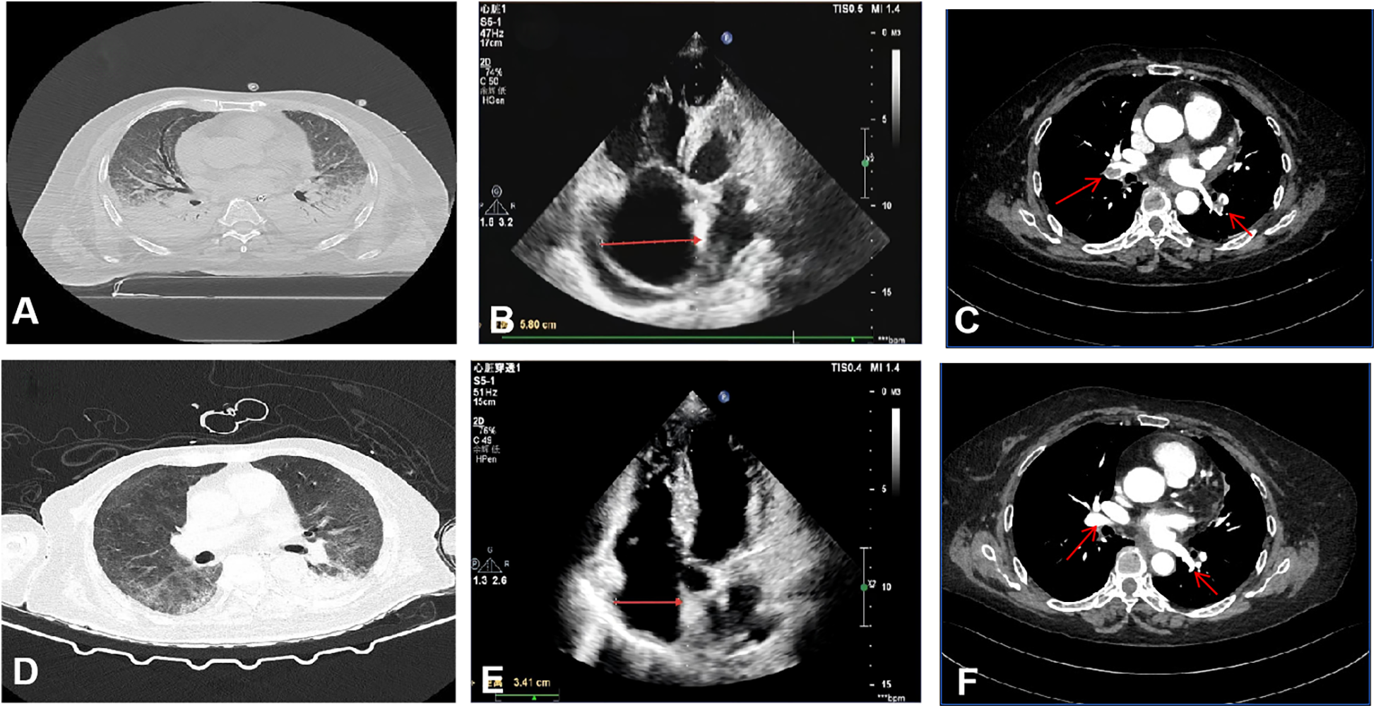 Imaging and echocardiographic findings before and after treatment. (A–C) Pre-treatment: (A) Chest CT shows bilateral pulmonary consolidation and interstitial infiltrates. (B) Transthoracic echocardiography reveals right atrial enlargement (transverse diameter 5.8 cm). (C) CT pulmonary angiography demonstrates extensive bilateral pulmonary embolism. (D–F) Post-treatment: (D) Chest CT indicates resolution of pulmonary consolidation and marked improvement of interstitial opacities. (E) Echocardiography shows significant reduction in right atrial size (transverse diameter 3.41 cm). (F) CT pulmonary angiography confirms substantial reduction in thrombus burden.