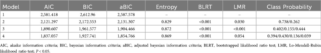 After data verification and double entry by two independent researchers, latent profile analysis was conducted using Mplus8.3. The average scores of the four dimensions from the Home Volume Management Self-Rating Scale for Patients with Chronic Heart Failure were used as indicator variables. The model selection process began with a baseline model containing a single class, and the number of latent classes was progressively increased. Model selection criteria based on literature (21, 26): (1) Akaike Information Criterion (AIC), Bayesian Information Criterion (BIC), and Adjusted BIC (aBIC): Lower values indicate better model fit. (2) Entropy: Ranging from 0 to 1, higher values indicate greater classification accuracy. An entropy ≥0.80 suggests good class separation. (3) Lo-Mendell-Rubin Likelihood Ratio Test (LMR) and Bootstrap Likelihood Ratio Test (BLRT): A p-value < 0.05 indicates that the model with k classes fits significantly better than the model with k-1 classes.