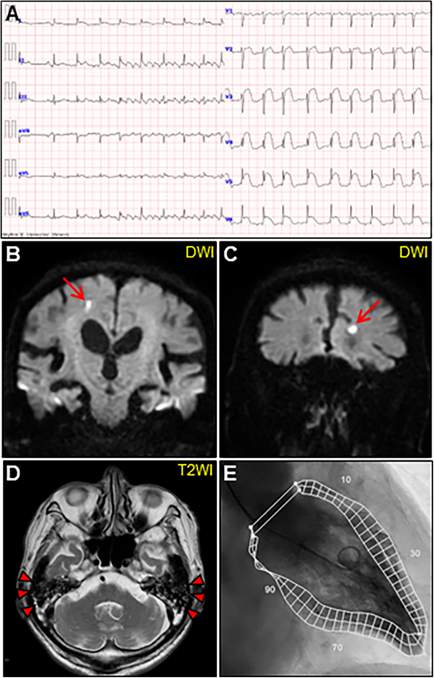Initial examinations. (A) Initial electrocardiography. (B, C) Coronal views of brain diffusion-weighted magnetic resonance images (DWIs) showing multiple acute cerebral infarctions (arrows). (D) T2-weighted image (T2WI) showing fluid collection as a hyperintense area in bilateral mastoid cavities (arrowheads). (E) Left ventriculogram on day 2 after admission showing normal hyperkinetic contractions with an ejection fraction of 60%.