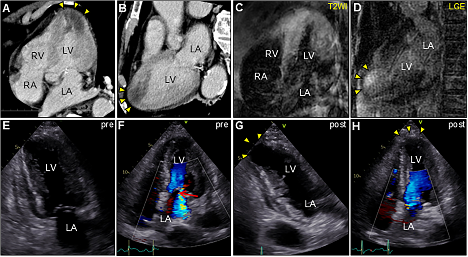 Enhanced computed tomography (CT) and cardiac magnetic resonance imaging (CMR) (A,C, apical four-chamber view; B,D, long-axis view). CT showing low-attenuation areas of the left ventricular apex (arrowheads). T2-weighted image (T2WI) showing diffuse myocardial edema. Late gadolinium enhancement (LGE) images showing the same region as that of CT (arrowheads). Serial transthoracic echocardiography (TTE). (E,G, apical two-chamber view; and F,H, apical four-chamber view). (E,F) TTE on day 6 after admission showing severe global left ventricular systolic dysfunction with increased left ventricular wall thickness (LVWT) accompanied by severe mitral regurgitation (arrow) in color Doppler mode [LVWT, 14 mm; and ejection fraction (EF), 40%]. (G,H) Follow-up TTE 2 weeks after corticosteroid treatment showing considerable improvement in left ventricular function and mitral regurgitation (LVWT, 12 mm; and EF, 57%). Note the left ventricular apical aneurysmal formation (arrowheads). LA, left atrium; LV, left ventricle; RA, right atrium; RV, right ventricle.