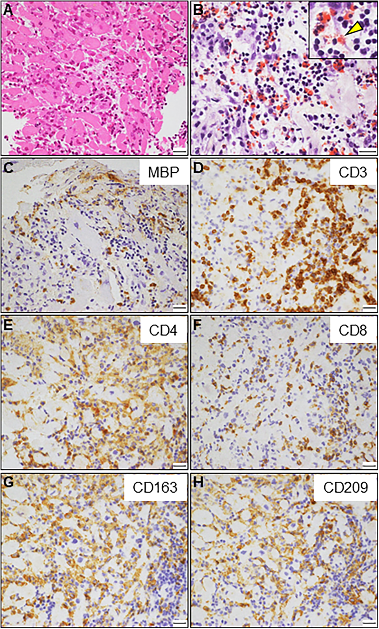 Endomyocardial biopsy. (A) Hematoxylin and eosin staining. (B) Direct fast scarlet staining showing intense eosinophilic infiltration. The inlet shows a magnified view of degranulated eosinophilic granules (arrowhead). (C) Immunostaining for major basic proteins (MBP). (D–F) Immunohistochemistry showing abundant inflammatory infiltrates comprising CD3 + and CD4+ T-lymphocytes. A small number of CD8+ T lymphocytes are also observed. (G, H) A considerable number of CD163 + and CD209+ M2 macrophages are observed. Scale bars: 20 μm.