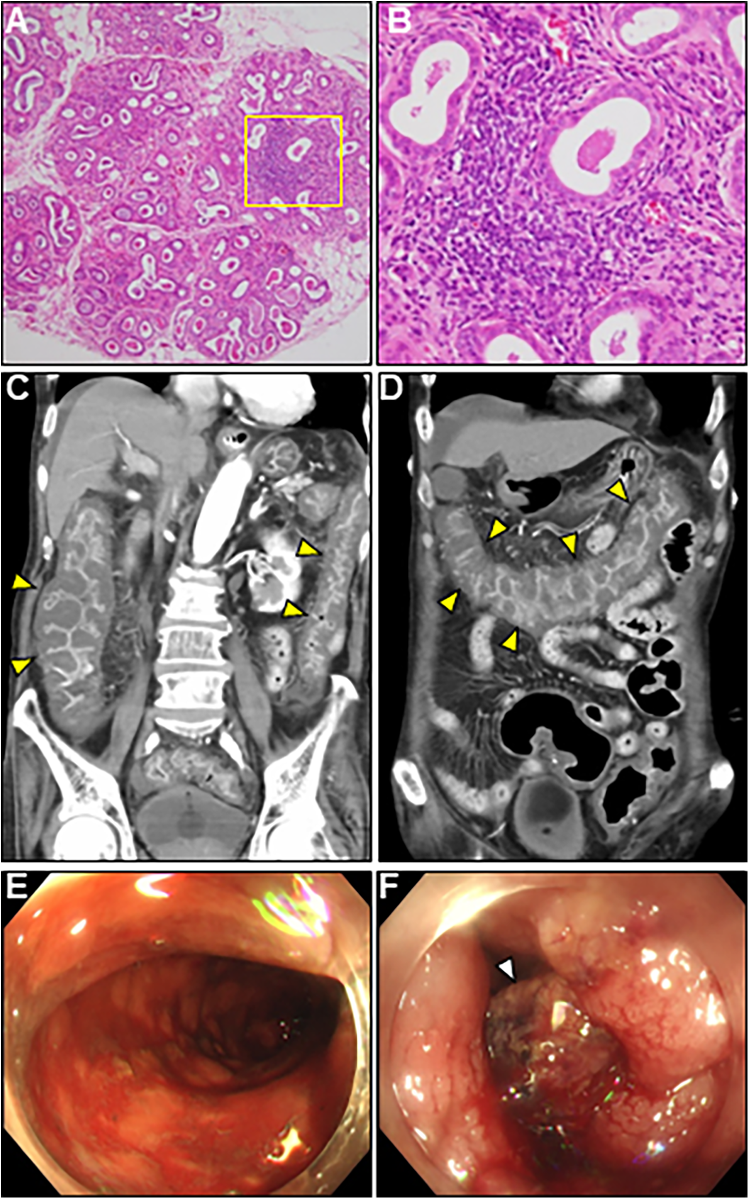 Lip gland histopathology, computed tomography (CT) and colonoscopy findings. (A) Pathology of a minor salivary gland biopsy (20× magnification). (B) Magnified view of the box in (A) at 40×. Hematoxylin and eosin staining showing focal lymphocytic sialadenitis with periductular aggregates of >50 lymphocytes. (C,D) Coronal enhanced CT revealing whole and homogeneous large bowel wall thickening characterized by submucosal edema and mucosal thickening with the disappearance of the haustral folds (arrowheads). Note the intact small bowel. (E,F) Colonoscopy revealed continuous diffuse mucosal inflammation from the rectum to the transverse colon. There are no vascular patterns, multiple ulcers with friability, mucosal desquamation (arrowhead), or contact bleeding.