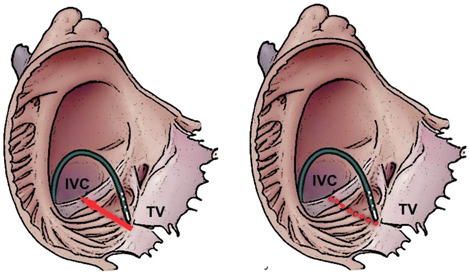 Dragging (left panel) and point-by-point (right panel) ablation strategies to creation an ablation line on the cavotricuspidal isthmus. IVC, inferior vena cava; TV, tricuspidal valve.