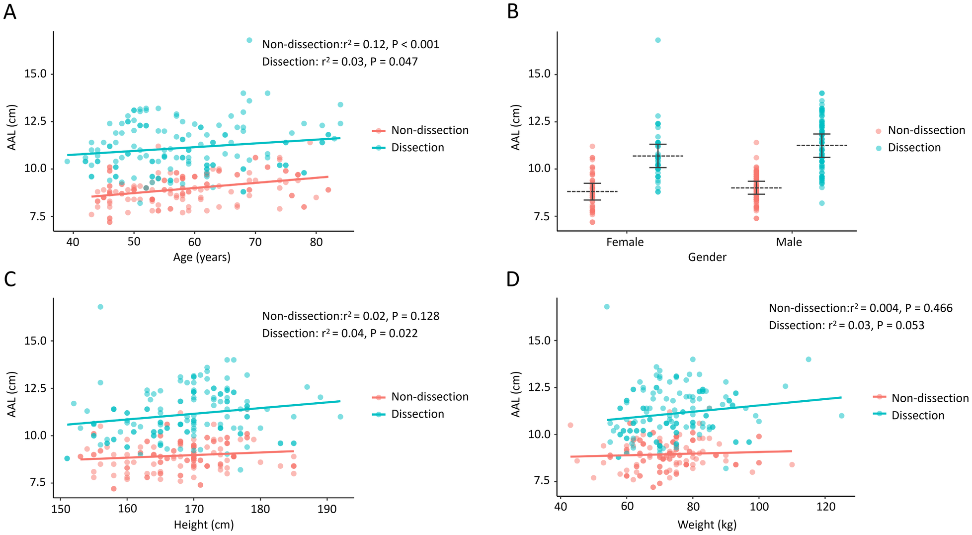 The association of the AAL with age, gender, height, and weight in TAAD patients and control participants. (A) The AAL positively correlates with increasing age in both the TAAD group and the control group. (B) Patients with TAAD presented with a longer AAL in both males and females. (C) The AAL correlates with height in the TAAD group. (D) The AAL does not correlate with body weight in both groups. AAL, ascending aortic length; TAAD, type A aortic dissection.
