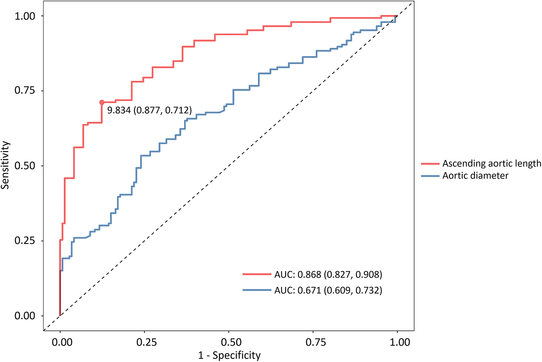 An analysis of the ROC curve of the AAL demonstrated an AUC of 0.868 (95% CI, 0.827–0.908) with a cutoff value of 9.8 cm to be associated with TAAD (sensitivity, 71.2%; specificity, 87.7%). In contrast, the ascending aortic diameter demonstrated an AUC of 0.671 (95% CI, 0.609–0.732) with a sensitivity of 53.4% and a specificity of 76% (Figure 4). Statistical comparison using the Delong test indicated a significant difference between the two AUCs (P < 0.001). In addition, internal bootstrap resampling (1,000 iterations) yielded consistent results, reinforcing the superior discriminative ability of the AAL (P < 0.001).