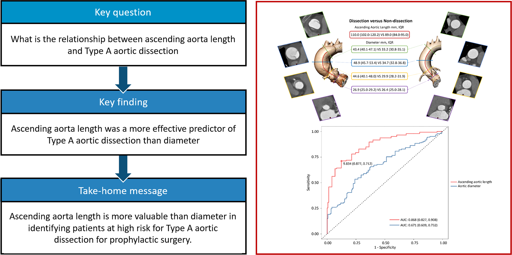 Aortic length performed better to predict type A aortic dissection compared with diameter.