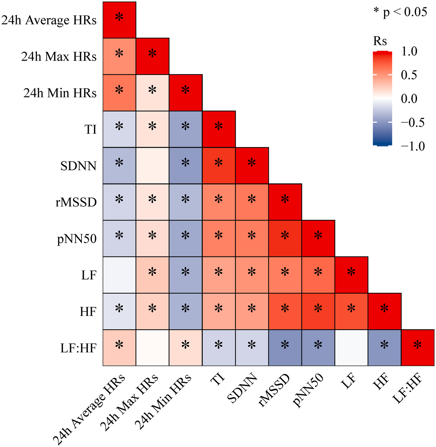 Spearman correlation heatmap between 24-hour holter monitoring indicators.