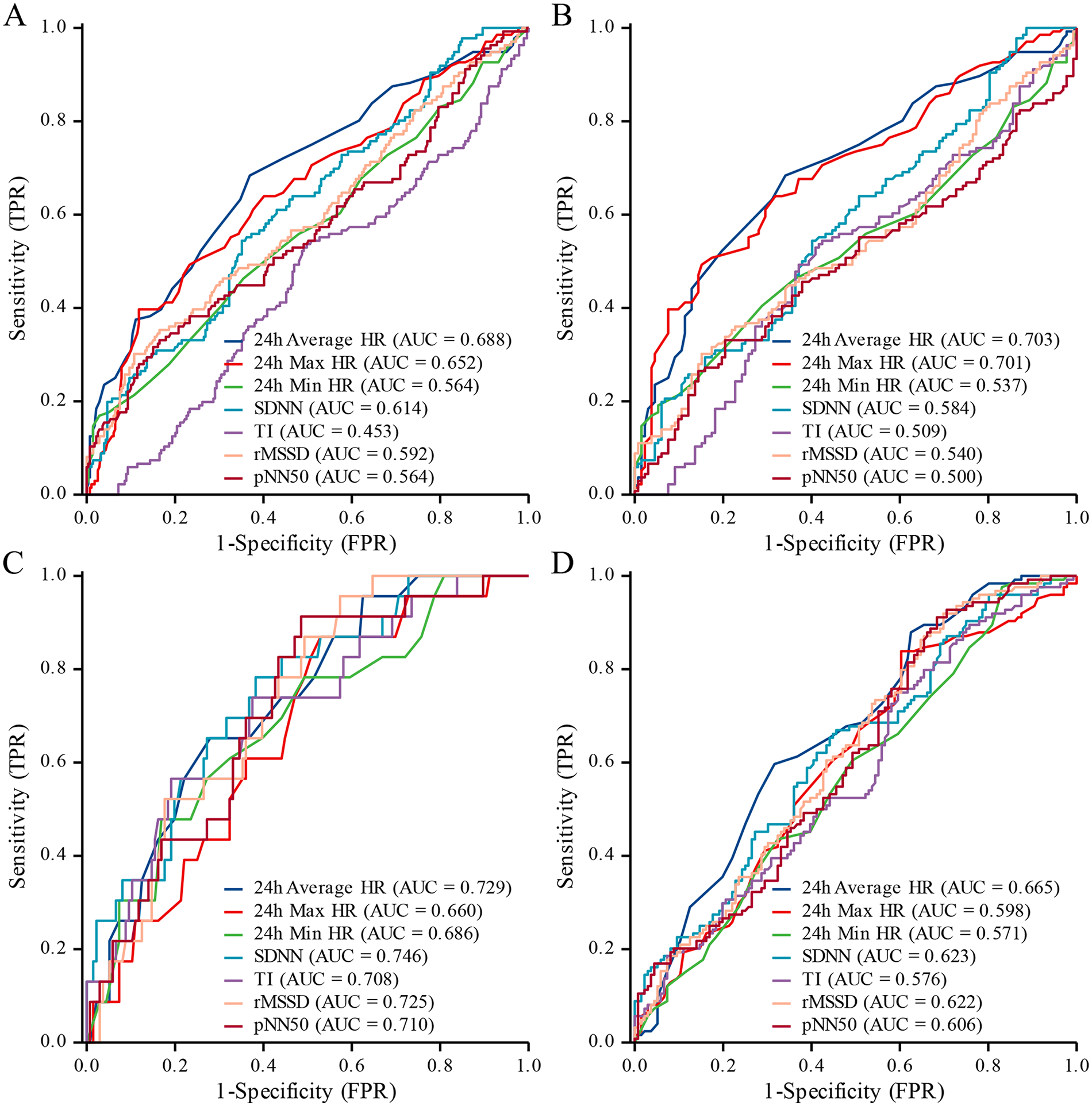 Multivariable logistic regression revealed that 24 h average HRs (OR: 0.935; 95% CI: 0.912–0.959; P < 0.001), 24 h maximum HRs (OR: 0.976; 95% CI: 0.964–0.989; P < 0.001), 24 h minimum HRs (OR: 0.947; 95% CI: 0.915–0.980; P = 0.002), TI (OR: 1.032; 95% CI: 1.009–1.056; P = 0.006), SDNN (OR: 1.029; 95% CI: 1.016–1.043; P < 0.001), rMSSD (OR: 1.023; 95% CI: 1.007–1.038; P = 0.004), and pNN50 (OR: 1.028; 95% CI: 1.006–1.051; P = 0.013) were independently associated with the occurrence of VVS. ROC analysis showed that 24 h average HRs (AUC: 0.688; 95% CI: 0.632–0.744), 24 h maximum HRs (AUC: 0.652; 95% CI: 0.594–0.709), and SDNN (AUC: 0.614; 95% CI: 0.557–0.672) exhibited moderate predictive ability for VVS.