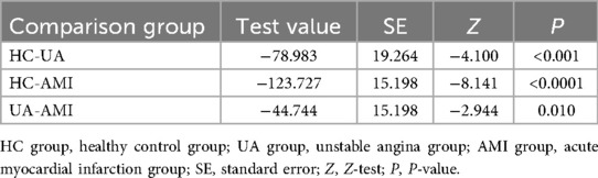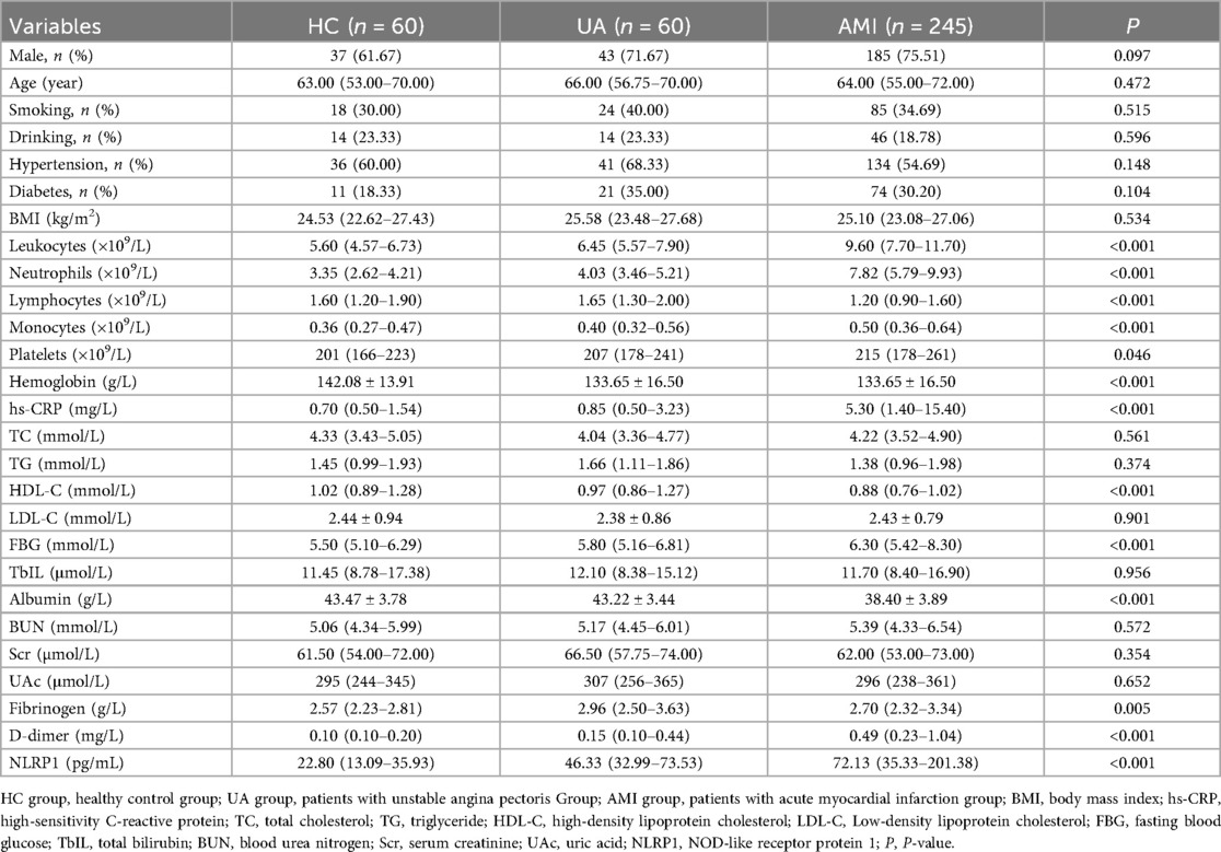 This study included a total of 345 participants, including 60 healthy controls (HC group), 60 patients with UA (UA group), and 245 patients with AMI (AMI group). There were no significant differences among the three groups in gender distribution (Table 1, with male proportions of 61.67%, 71.67%, and 75.51% respectively, P = 0.097) and the prevalence of diabetes (Table 1, 18.33%, 35.00%, and 30.2% respectively, P = 0.104). Compared with the other two groups, the AMI group had significantly elevated levels of white blood cell count, neutrophils, monocytes, hs-CRP, D-dimer, NLRP1, and fasting blood glucose (FBG) (Table 1, P < 0.05). Subsequent pairwise comparisons further confirmed significant differences in NLRP1 expression among the groups. The NLRP1 level was the highest in the AMI group, significantly higher than that in the HC group (Table 2, Figure 2, Z = −8.141, P < 0.0001) and the UA group (Table 2, Figure 2, Z = −2.944, P = 0.01). The NLRP1 level in the UA group was also significantly higher than that in the HC group (Table 2, Figure 2, Z = −4.100, P < 0.001).