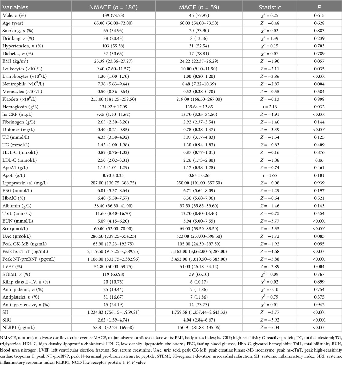 Furthermore, the levels of systemic inflammatory indicators, namely, SII, SIRI, and NLRP1, were significantly higher in the MACE group (Table 3, Figure 3, P < 0.05).