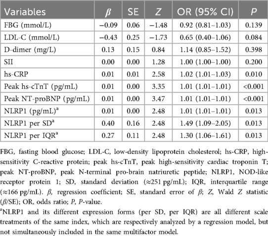 To further contextualize our findings on NLRP1 and inflammation in AMI, it is important to note the role of systemic inflammatory assessment in our study design. While single inflammatory markers [e.g., high-sensitivity C-reactive protein (hs-CRP) and white blood cell count] were included in multivariable analyses to capture specific aspects of inflammation, we also incorporated composite indices—the systemic inflammatory index (SII) and systemic inflammatory response index (SIRI)—to achieve a more comprehensive evaluation of systemic inflammatory imbalance. These indices, which integrate immune cell subset interactions (neutrophils, lymphocytes, platelets/monocytes), have been validated as reliable prognostic tools in AMI (9, 10), and their inclusion in relevant statistical analyses supplemented our assessment of inflammatory status.