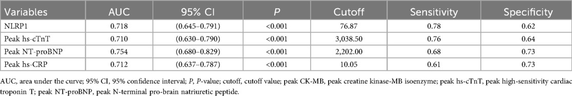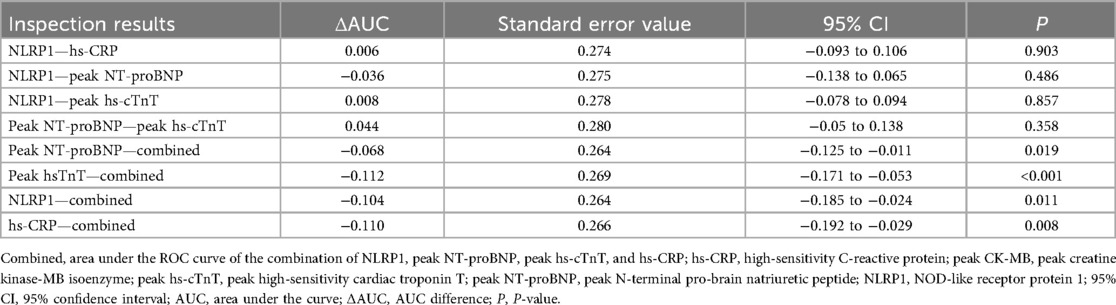 ROC curve analysis showed that the AUC of NLRP1 alone for predicting MACE was 0.718 (Figure 6, Table 5, 95% CI: 0.645–0.791, P < 0.001), with a cutoff value of 76.87 pg/mL, a sensitivity of 0.78, and a specificity of 0.62. The DeLong test indicated that there was no significant difference in its AUC compared with the individual detections of hs-CRP, peak NT-proBNP, and peak hs-cTnT (Table 6, P > 0.05). However, the AUC of the combined detection of NLRP1 with the above three markers reached 0.822. Meanwhile, the AUC of the combined index was also significantly higher than that of the individual detections of hs-CRP (Table 6, ΔAUC = −0.110, P = 0.008), peak hs-cTnT (Table 6, ΔAUC = −0.112, P < 0.001), and peak NT-proBNP (Table 6, ΔAUC = −0.068, P = 0.019).