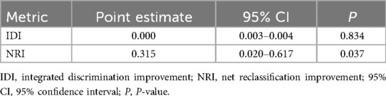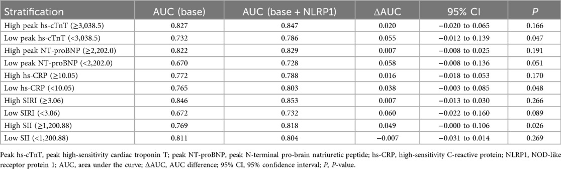 To further explore whether the prognostic value of NLRP1 differed across patient subgroups, we performed stratified analyses based on biomarker cutoff values. As shown in Table 7, adding NLRP1 to the baseline model improved AUC across most subgroups. The improvements were statistically significant in low peak hs-cTnT (<3,038.5) (ΔAUC = 0.055, P = 0.047), low hs-CRP (<10.05) (ΔAUC = 0.038, P = 0.048), and high SII (≥1,200.88) (ΔAUC = 0.049, P = 0.026). Other subgroups showed modest upward trends, but not statistically significant. These results suggest that the incremental prognostic value of NLRP1 is particularly evident in patients with lower levels of myocardial injury (low peak hs-cTnT), lower systemic inflammation (low peak hs-CRP), or high immune-inflammatory burden as captured by SII.