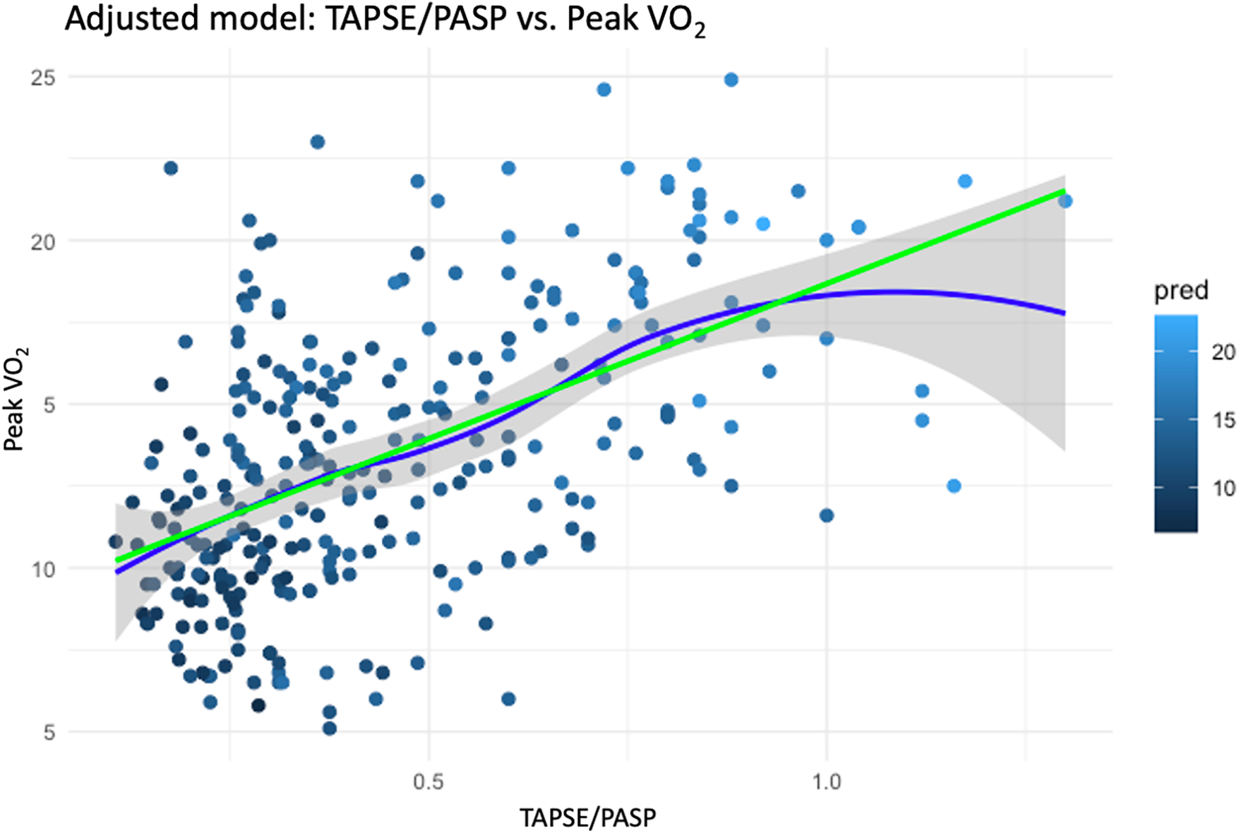 The continuous association between TAPSE/PASP and peak VO₂ was assessed using multivariable linear regression. For analysis with TAPSE/PASP as the primary predictor variable, linear regression was adjusted for demographics and co-morbidities, with covariates selected based on a priori knowledge (14–18). A DAG was used to identify assumed relationships between variables and detect potential confounders (19) (Supplementary Figure S2).