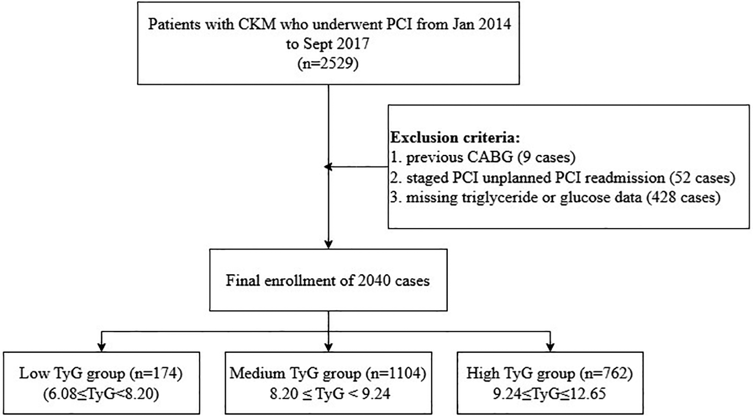 In this retrospective analysis, a sum of 2,529 CKM patients receiving PCI treatment at Cangzhou Central Hospital from January 2014 through September 2017 underwent initial evaluation. The selection standards included: (1) individuals aged 18 years or above; (2) confirmed CAD requiring PCI intervention; and (3) calculated glomerular filtration rate below 90 mL/min/1.73 m². Subjects were not eligible if they presented any of these factors: (1) history of coronary artery bypass grafting; (2) staged or unplanned PCI readmission; or (3) incomplete TG or glucose data. Following the application of these criteria, 2,040 individuals were ultimately included in the analysis (Figure 1).