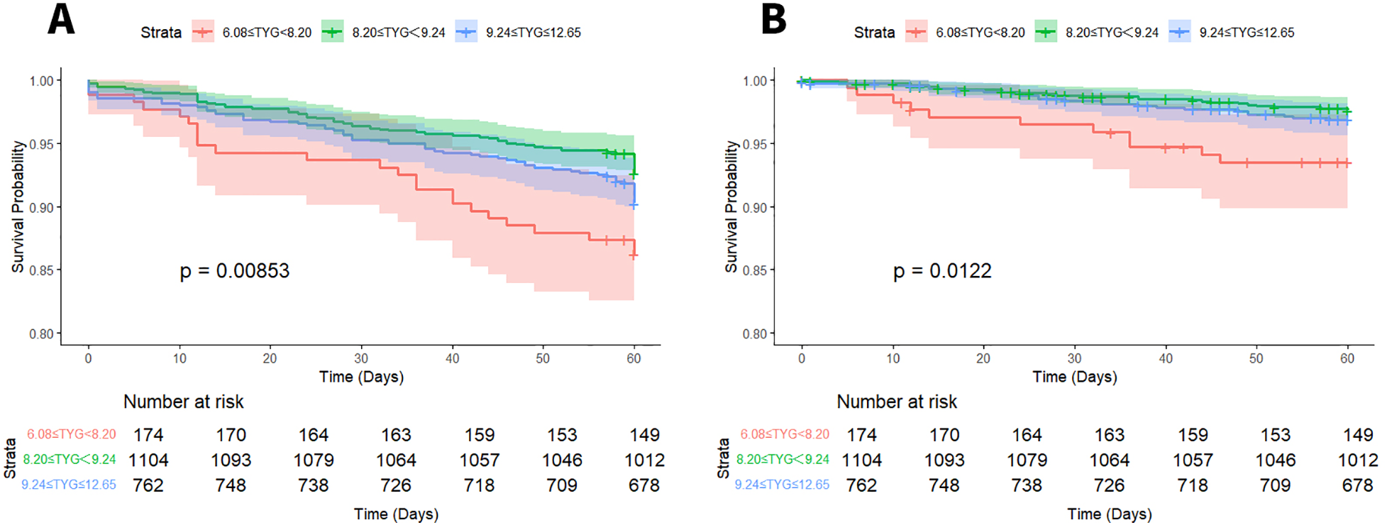 Kaplan–Meier survival curves for ACM (A) and CM (B) based on TyG index stratification.