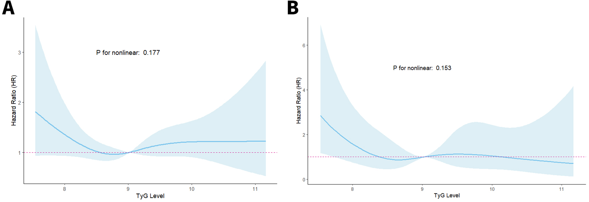Of the 2,040 patients analyzed, 1,186 (58.14%) were male and 854 (41.86%) female, with 55.83% aged ≥65 years. After analysis with multivariate Cox regression, elevated TyG index measurements demonstrated a notable association with heightened probabilities of ACM and CM occurrence. In comparison to the medium TyG index group, individuals categorized within the low TyG index group exhibited markedly elevated risks for ACM [hazard ratio [HR] = 1.82, 95% confidence interval [95%CI]: 1.15–2.88] and CM (HR = 2.68, 95%CI: 1.32–5.43). Additionally, a higher ACM risk was noted in the high TyG index group (HR = 1.39, 95%CI: 1.01–1.92). The RCS analysis identified no nonlinear association between the TyG index and either outcome (P-values for nonlinearity test: 0.177 and 0.153, respectively).
