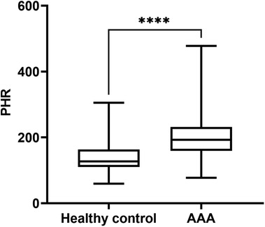 Figure 1. PHR levels in patients with AAA and healthy control group. Data were presented as median (min -max). AAA, abdominal aortic aneurysm; PHR, platelet to high-density lipoprotein cholesterol ratio; ****P < 0.0001.