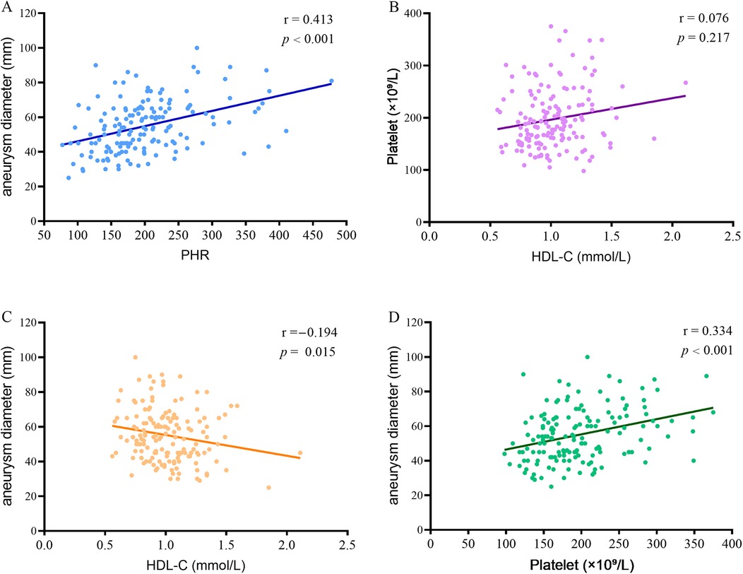 To further evaluate whether the PHR is associated with the disease progression in patients with AAA, we further examined the correlation between PHR and the diameter of AAA. The results showed that there was a significant positive correlation between the PHR level and the aneurysm diameter in AAA patients (r = 0.413, P < 0.001) (Figure 2A). This suggests that PHR has potential value in assessing the progression of AAA. Additionally, we conducted a detailed analysis of the correlation between HDL-C and platelet count in patients with AAA. Our results showed no significant correlation between these two variables (r = 0.076, P = 0.217) (Figure 2B), suggesting that HDL-C and platelets do not have a substitutable relationship. Further correlation analysis between HDL-C and aneurysm diameter in AAA patients revealed a significant negative correlation (r = −0.194, P = 0.015) (Figure 2C), which implies that lower HDL-C levels may be associated with aneurysm expansion. In contrast, a significant positive correlation was observed between platelet count and aneurysm diameter in AAA patients (r = 0.334, P < 0.001) (Figure 2D), indicating that higher platelet counts may be associated with aneurysm expansion.