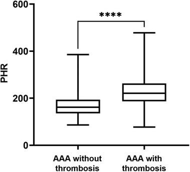 Figure 3. PHR levels in AAA patients divided by the thrombosis. Data were presented as median (min -max). AAA, abdominal aortic aneurysm; PHR, platelet to high-density lipoprotein cholesterol ratio; ****P < 0.0001.