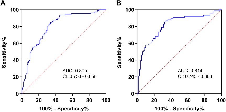 Figure 4. Diagnostic value of PHR in AAA patients. (A) The ROC curves of PHR to AAA patients and healthy controls. (B) The ROC curves of PHR to thrombosis in AAA patients. AUC, area under the curve; CI, confidence interval.