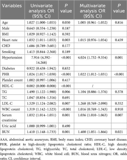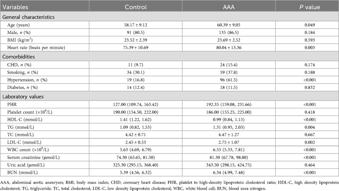 Accumulating evidence underscores the association of PHR with various cardiovascular diseases, such as hypertension, heart failure, and stroke (20–23), and a retrospective multicenter study indicates that elevated PHR increases the long-term mortality risk in patients with CHD, serving as a high-risk marker to guide clinical intervention (24).Given the overlapping pathophysiological pathways between these conditions and AAA, it is plausible to hypothesize that PHR could serve as a valuable indicator for AAA. This hypothesis is further supported by the mechanistic linkages between platelet activation, lipid metabolism, and aneurysm development. Clinically, PHR stands out for its practicality and cost-effectiveness. It can be readily calculated from routine blood tests, making it easily accessible for widespread application across diverse healthcare settings (24). This accessibility is crucial for the routine monitoring and early detection of AAA, potentially enhancing clinical decision-making and patient outcomes.