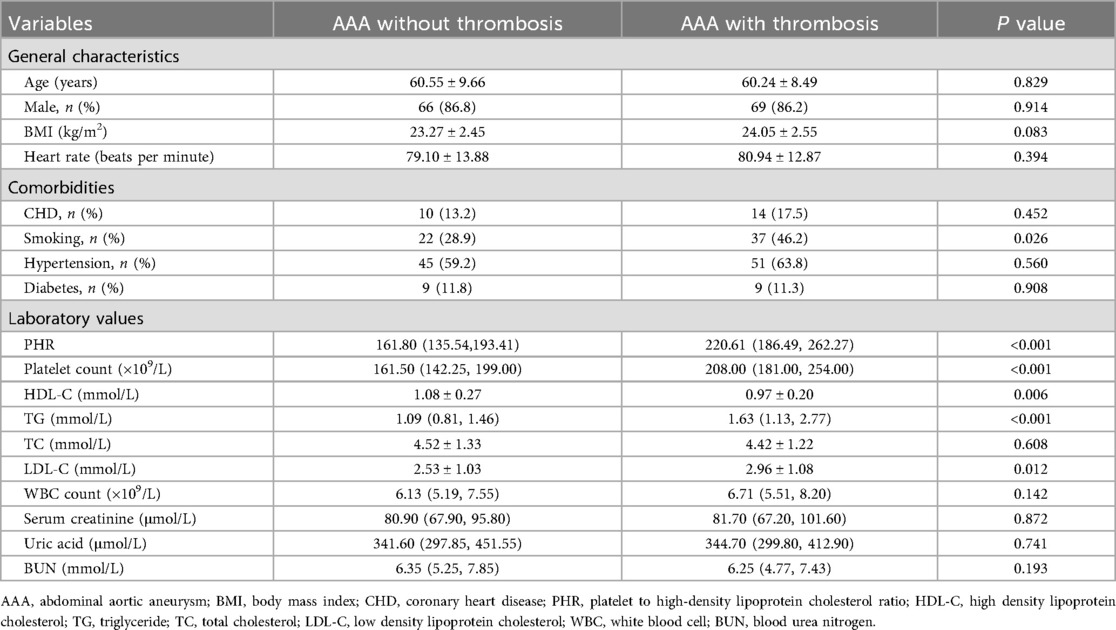 Methods: A total of 156 patients with AAA and 113 healthy controls were enrolled. Among them, 80 patients with AAA had concomitant thrombosis. Serum samples were collected upon admission to the hospital and before treatment. The equation for PHR calculation is: PHR = [platelet (1,000 cells/µl)/HDL-C (mmol/L)]. The optimal PHR cut-off was determined via ROC analysis, and logistic regression identified AAA predictors.