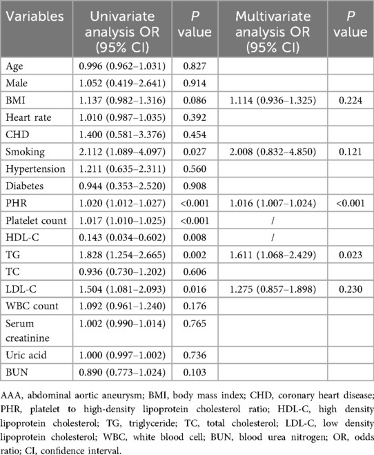 Table 3. Univariate and multivariate logistic regression analysis showing the independent predictors for AAA.