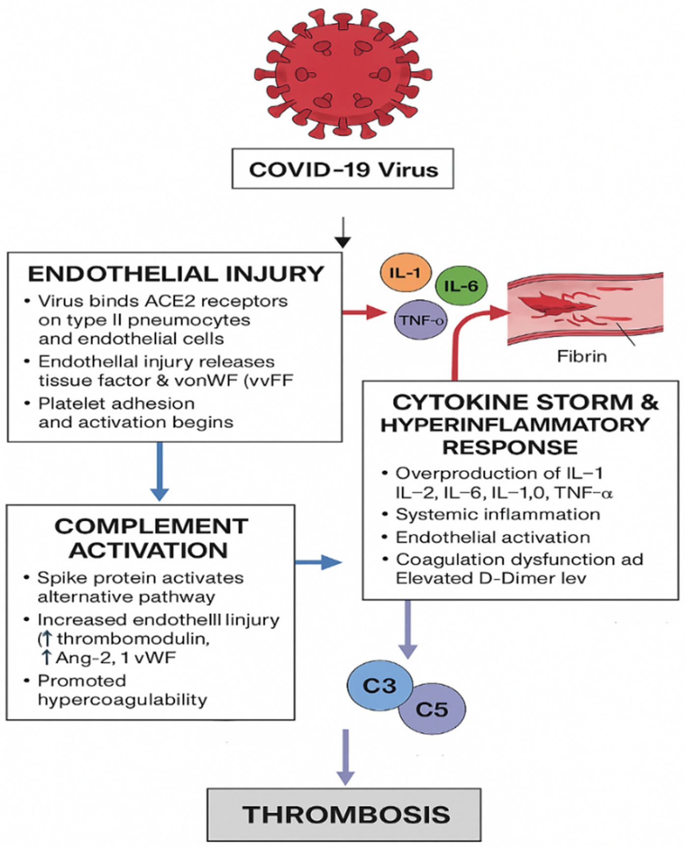 Additionally, hypoxia triggers the production of hypoxia-inducible factor-1α (HIF-1α) and plasminogen activator inhibitor-1 (PAI-1), suppressing fibrinolysis and promoting clot persistence. The cytokine storm seen in severe COVID-19—involving elevated levels of interleukins (IL-6, IL-1β) and tumor necrosis factor-α (TNF-α)—increases thrombin generation and fibrin deposition. Moreover, complement activation and neutrophil extracellular traps (NETs) further boost coagulation signaling.