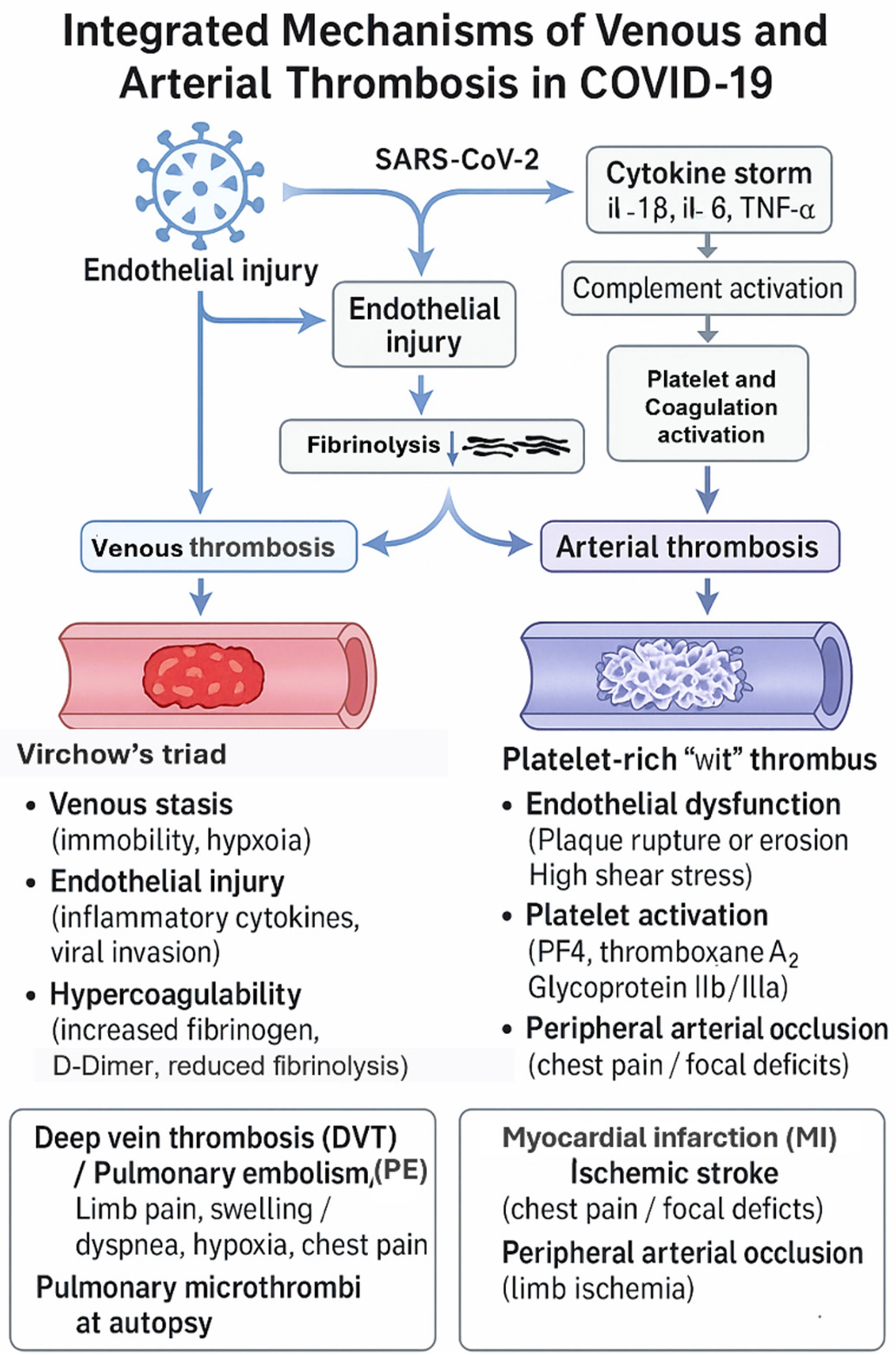 Arterial thrombosis in COVID-19 mainly arises from endothelial dysfunction, platelet hyperreactivity, and inflammation-induced coagulation activation. This virus's direct invasion of endothelial cells causes widespread endothelialitis, which disrupts vascular integrity and leads to increased permeability, decreased nitric oxide production, and the loss of natural anticoagulant properties. The subsequent downregulation of ACE2 results in excess angiotensin II, promoting vasoconstriction, oxidative stress, and further endothelial damage (12).
