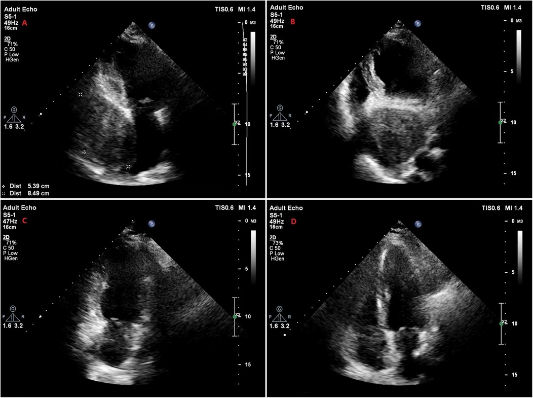 Figure 1. Transthoracic echocardiography images of the patient. (A,B) Apical 2-chamber (A) and apical 4-chamber (B) views of a hypoechoic mass located posterior to the left atrium and left ventricle, and compressing the left atrium. (C,D) Apical 2-chamber (C) and apical 4-chamber (D) views of the patient at one year follow-up, showing that the mass was successfully removed.
