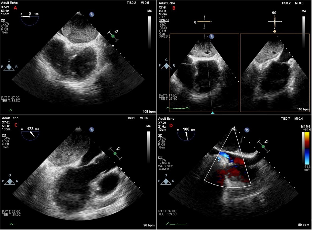 Figure 2. Transesophageal echocardiography images of the patient. (A) Midesophageal 4-chamber view. (B) Biplane view showing that the mass contains an area of cystic degeneration. (C) Midesophageal long axis view showing that the mass is compressing the left atrium, mitral annulus and partially the left ventricle. (D) Midesophageal bicaval view showing the mass creating mild compression on the inferior vena cava.