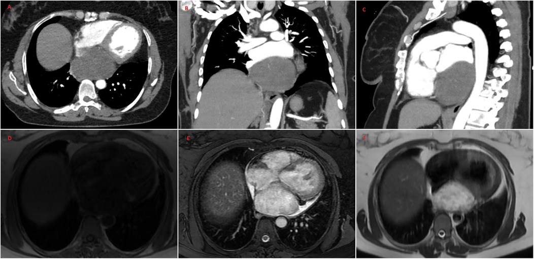 Figure 3. Thoracic CT angiography (A–C) and MRI (D–F) images of the patient. CT and MRI show a well-circumscribed pericardial mass measuring 10.1 cm × 8.1 cm × 5.2 cm located in the posterior mediastinum. CT and MRI demonstrated no evidence of the invasion of the inferior vena cava, left atrium, left ventricle and pulmonary veins. MRI showed that the mass was T1-hypointense (D) and T2-hyperintense (F) The mass was observed to have homogeneous signal intensity on T1 and T2-weighted images (D–F) The mass showed high signal intensity on T2-weighted fat suppression sequence (E) CT, computed tomography; MRI, magnetic resonance imaging.
