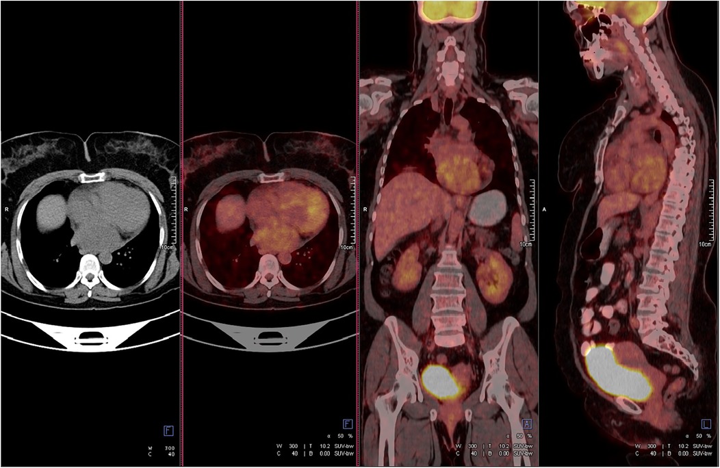 Figure 4. Positron emission tomography-computed tomography showed mild to moderate fluorodeoxyglucose uptake in the mass. The standard uptake value was ∼5.2. No metastatic lesions were detected.