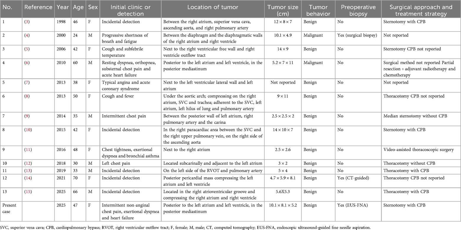 13. Li C, Zhang J, Fan R, Chen L, Liu D, Lin H. Benign pericardial schwannoma with massive pericardial effusion in a Chinese man: a case report. Echocardiography. (2019) 36(10):1944–6. doi: 10.1111/echo.14492