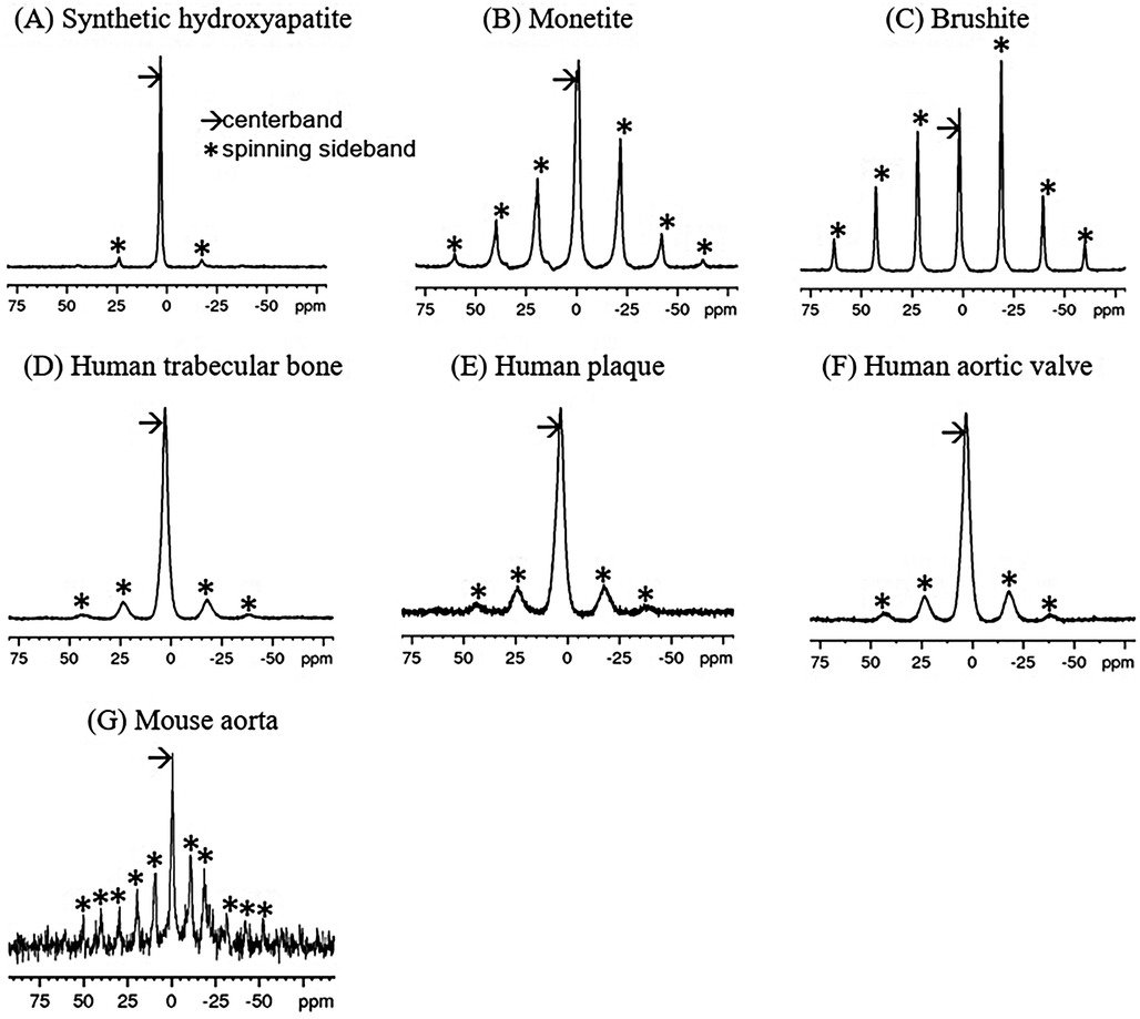 Methods: Solid state MR spectra were acquired from biological specimens of human trabecular bone (n = 1), human vascular plaque (n = 1), human calcified aortic valves (n = 5), as well as calcified aortic tissues of apolipoprotein E-deficient mice (n = 1) fed a high cholesterol diet. Synthetic hydroxyapatite [Ca10(OH)2(PO4)6] and synthetic brushite (CaHPO4·2H2O) were used to model the solid state 31P MR spectra of the phosphate ion PO4–3 and hydrogen phosphate ion HPO4–2, respectively. Qualitative spectral features and quantitative metrics derived using Herzfeld-Berger analysis were assessed to characterize mineral composition and maturity.