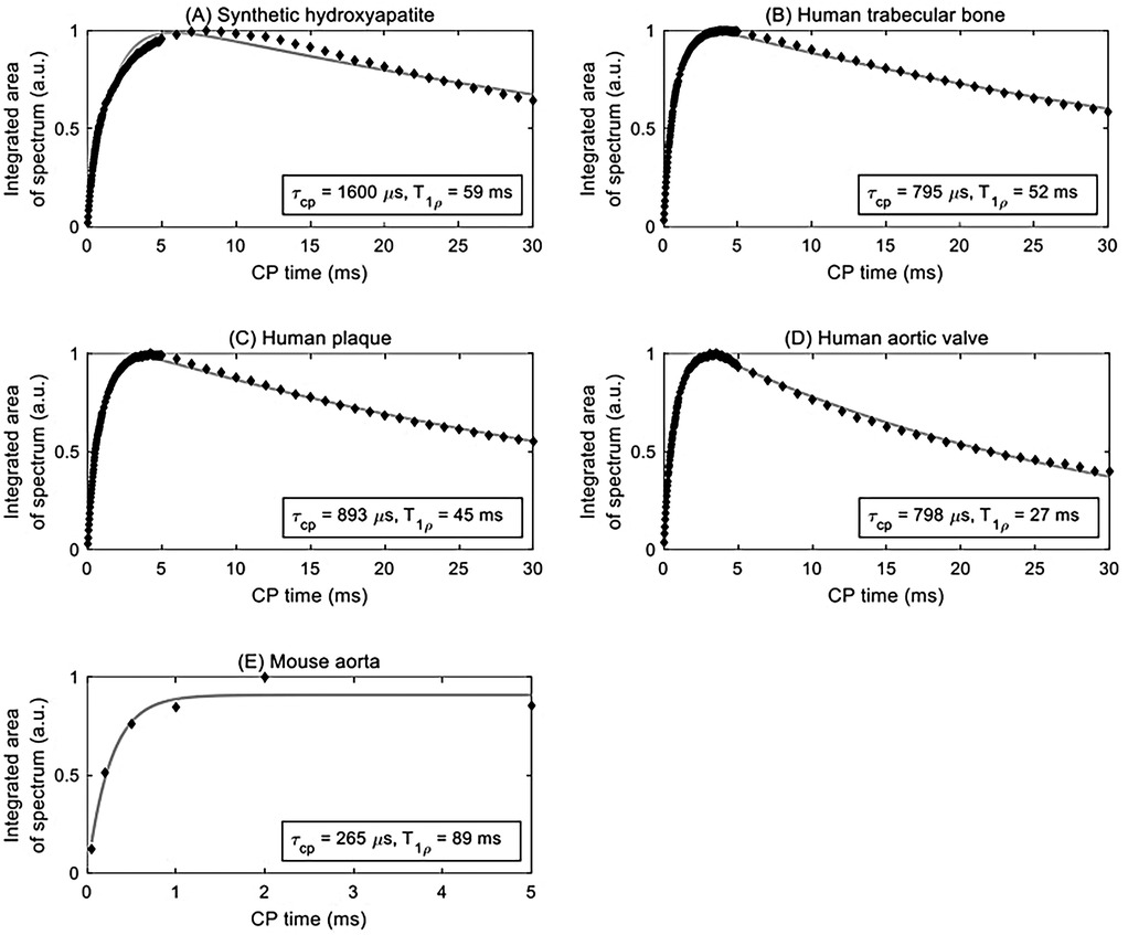 Figure 2. Curve fitting (solid grey line) of integrated area under the centerband (discrete points) provides an estimate of the CP time constant τCP and rotating frame spin-lattice relaxation time constant T1ρ for various samples: (A) synthetic hydroxyapatite, (B) human trabecular bone, (C) human plaque, (D) human aortic valve, and (E) mouse aorta.