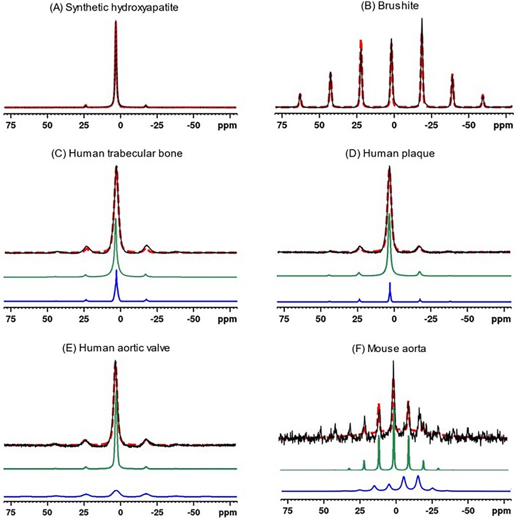 Figure 3. 31P MAS experimental spectra (solid black traces) of synthetic calcium phosphate compounds and biological specimens, and corresponding simulated spectra (red dashed traces) based on Herzfeld-Berger chemical shift tensor analysis. The synthetic compound spectra were fit to a single tensor, whereas biological specimens were fit to two tensors (individual simulated tensor spectra displayed as green and blue traces). The latter composite simulated spectra (red dashed traces) are the sums of the spectra from the two components. (A) Synthetic hydroxyapatite, (B) Brushite, (C) Human trabecular bone, (D) Human plaque, (E) Human aortic valve, (F) Mouse aorta.