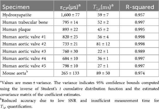 Hydroxyapatite, containing only unprotonated phosphate, was found to have the longest CP time constant at 1,600 µs. For comparison, brushite, containing only protonated phosphate, was found in a previous study (47) to have a CP time constant of 140 µs. The biological specimens in this study fall in between these two extremes. The human specimens tend to be in the range of 700–900 µs, whereas the mouse aorta specimen has a much shorter CP time constant of about 270 µs, much closer to that of brushite.