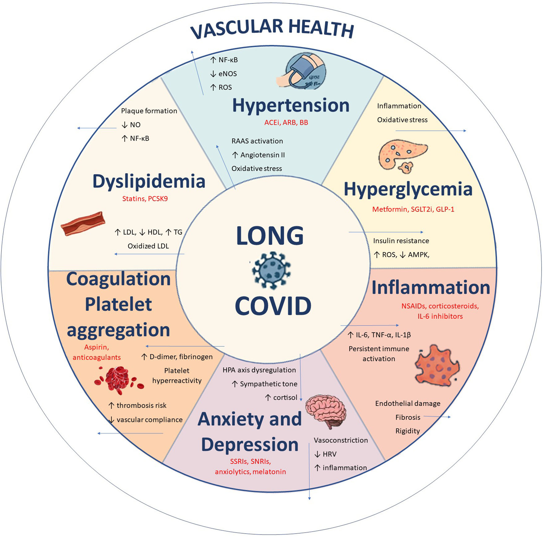 Vascular damage (especially that produced in LC) is triggered by alterations in the renin-angiotensin-aldosterone system and inflammatory mediators (24). These signalling pathways are therapeutic targets for numerous medication groups. COVID-19 interacts with angiotensin-converting enzyme 2 (ACE2), leading to increased angiotensin II levels and promoting endothelial dysfunction, inflammation (25), and elevated blood pressure (26). The relationship between dyslipidemia and SARS-CoV-2 infection is bidirectional: elevated cholesterol may enhance viral entry through increased ACE2 expression (27), while the infection itself raises cholesterol and triglyceride levels and promotes atheromatous plaque formation through oxidative stress (15). Lipid-lowering therapy can counteract these effects by reducing vascular inflammation through the endothelial nitric oxide synthase/ nitric oxide (eNOS/NO) and Yes-associated protein/transcriptional coactivator with PDZ-binding motif (YAP/TAZ) pathways, stabilizing atherosclerotic plaque, and activating longevity genes such as Klotho (28). In DM, SARS-CoV-2 can cause direct β-cell injury and reduced insulin production (29), while insulin resistance and chronic inflammation favour the persistence of LC (30). Beyond glucose control, agents such as metformin modulate immune and oxidative stress responses and may even inhibit viral replication (31, 32). Persistent endothelial injury and microclot formation, together with complement dysregulation and an increased von Willebrand factor/ a disintegrin and metalloproteinase with thrombospondin type 1 motif member 13 (ADAMTS13) ratio, underlie the prothrombotic state characteristic of LC, which could be mitigated by antiplatelet or anticoagulant therapy (33, 34).