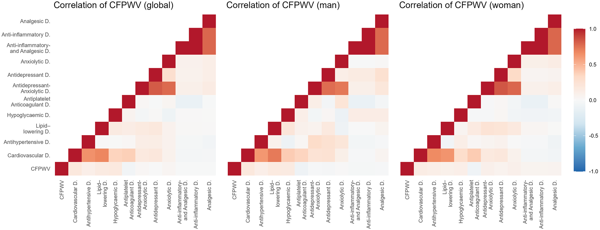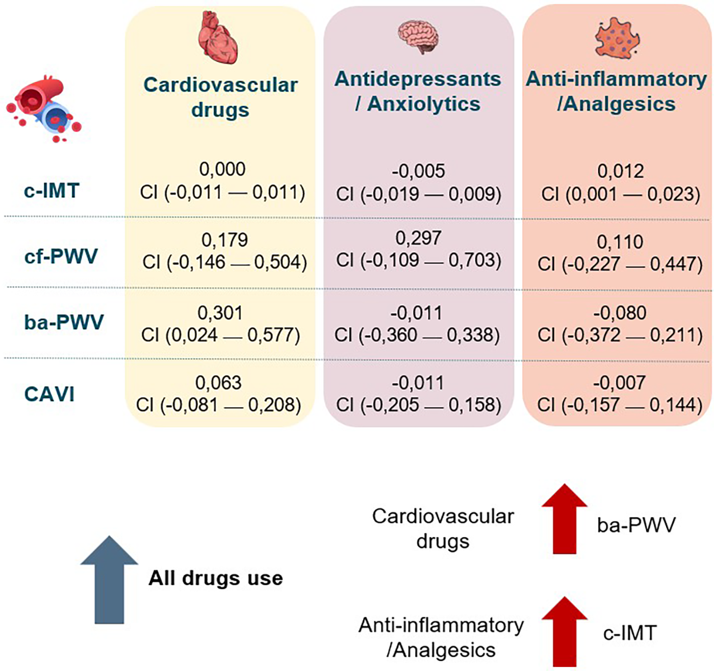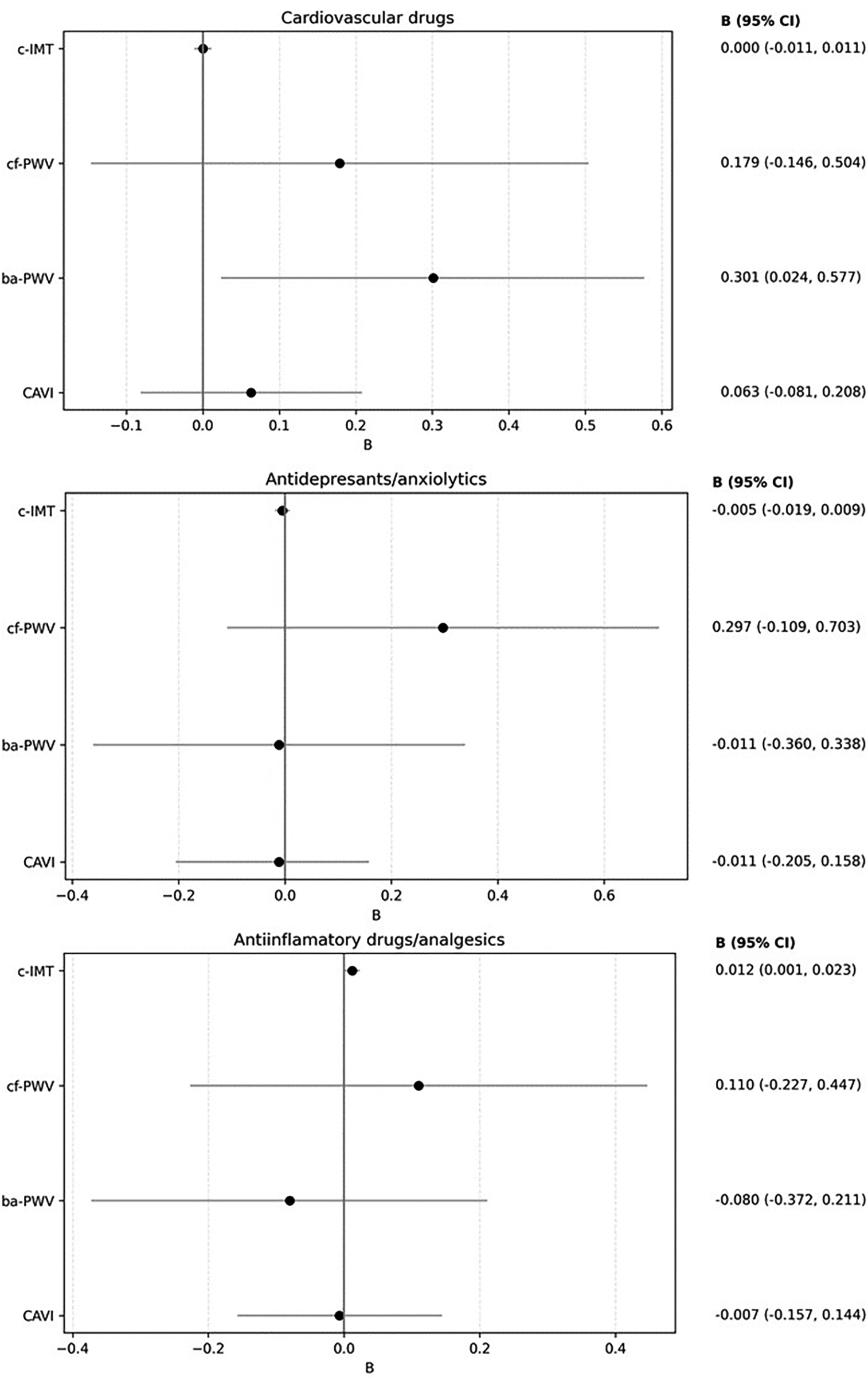 The means of two-category quantitative variables were compared using Student's t-test, while the chi-square test was used to compare two categories of categorical variables. Spearman's rho correlation coefficient was used to correlate the relationship between measures of vascular structure and function and the increase in the use of different medications. Multiple regression models were applied to identify the association between increased drug use and vascular parameters. The vascular parameters used as dependent variables were c-IMT measured in mm, cf-PWV and ba-PWV measured in m/s, and CAVI. The increases in the use of cardiovascular medications, antidepressants/anxiolytics and anti-inflammatory/analgesic medications were taken as independent variables. Age in years and sex were considered as control variables. A p value <0.05 was regarded as statistically significant. Data were analysed using SPSS for Windows, v28.0 (IBM Corp., Armonk, USA).