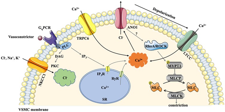 Figure 2. Schematic mechanism of ANO1 activation in VSMC. NKCC1 accumulates substantial Cl− in VSMCs and elevates the driving force for Cl− efflux. Exposed to vasoconstrictors, GqPCR is activated, and PIP2 is quickly converted to IP3 and DAG. ANO1 is directly activated by Ca2+ releasing from the SR via the IP3R or RyR. TRPC6 channel in cerebral arteries also contributes to elevated Ca2+ levels. Activation of ANO1 triggers Cl− outflow and depolarizes the membrane potential, leading to LTCC opening, which causes higher levels of intracellular Ca2+. The Ca2+- calmodulin complex induces phosphorylation of MLCK to constrict smooth muscle. Additionally, ANO1 is involved in Ang II-induced cerebral constriction via activating RhoA/ROCK signaling pathway, elevating the phosphorylation of MYPT1 and subsequent inhibition of MLCP. ANO1, Anoctamin-1; DAG, diacylglycerol; GqPCR, Gq protein coupled receptors; IP3, inositol trisphosphate; IP3R, IP3 receptors; LTCC, L-type calcium channels; MLCK, myosin light chain protein kinase; MLCP, myosin light chain phosphorylase; MYPT1:myosin phosphatase targeting subunit 1; NKCC1, Na+-K+-2Cl− cotransporter 1; PIP2, phosphatidylinositol 4,5-bisphosphate; RyR, ryanodine receptors; SR, sarcoplasmic reticulum; VSMC, vascular smooth muscle cells.