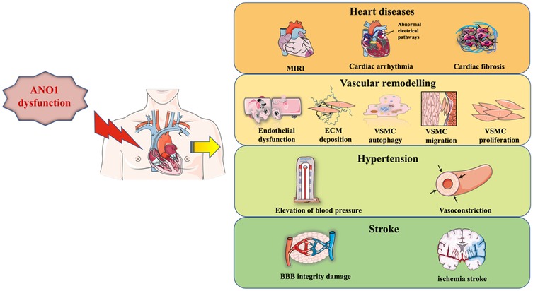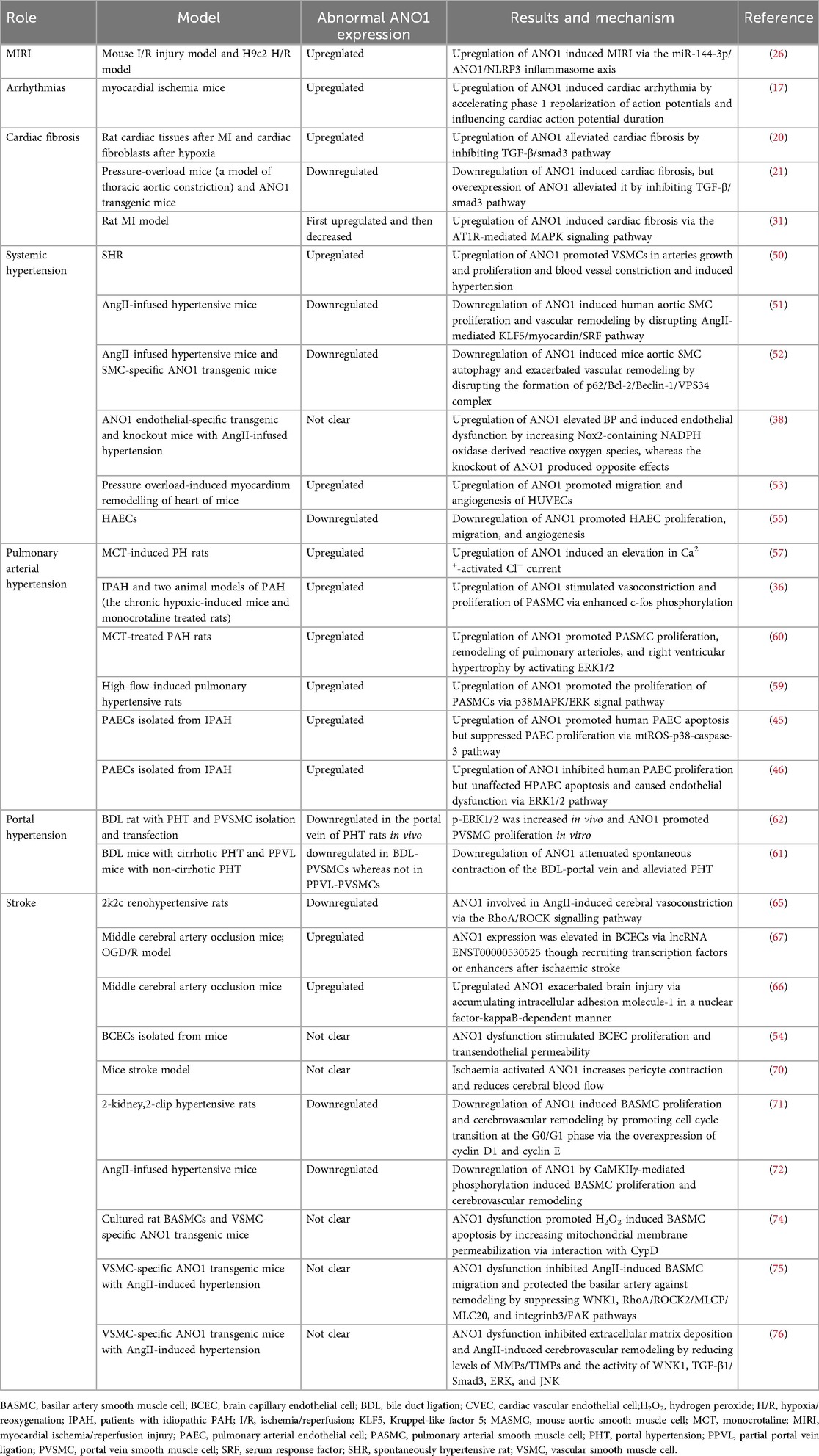 ANO1, anoctamin-1; BASMC, basilar artery smooth muscle cell; BBB, blood brain barrier; BCEC, brain capillary endothelial cell; BP, blood pressure; CF, cardiac fibroblasts; EC, endothelial cell; MIRI, myocardial ischemia/reperfusion injury; PAEC, pulmonary artery endothelial cell; PAH, pulmonary arterial hypertension; PASMC, pulmonary artery smooth muscle cell; SHR, spontaneously hypertensive rat; VSMC, vascular smooth muscle cell.