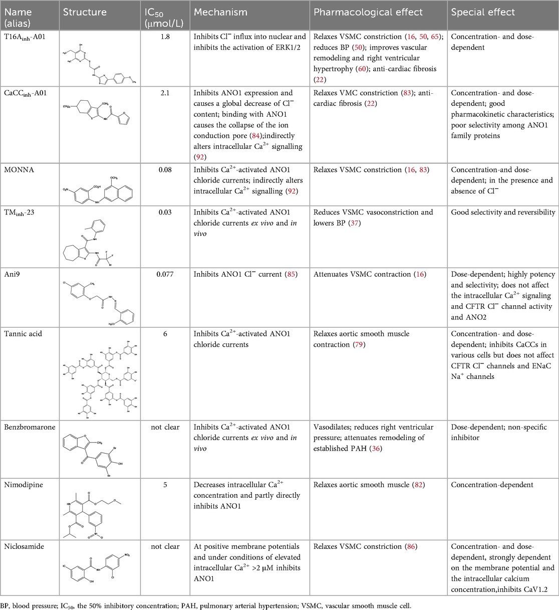 The discovery of new therapeutic avenues from drugs already on the market is a viable strategy for obtaining safe and effective therapeutic drugs (81). Several clinical agents have been discovered that exhibited inhibitory effects on ANO1, particularly benzbromarone and nimodipine (as shown in Table 2) (36, 82). Benzbromarone, a gout drug, lowered right ventricular pressure, reduced elevated PAH, and attenuated vascular remodelling in established PAH in a dose-dependent manner. The application of benzbromarone in treating hypertension, especially PAH, is considered a priority in the clinic (36). Nimodipine, an LTCC blocker, inhibited ANO1 indirectly by decreasing intracellular Ca2+ concentration or directly in a dose-dependent manner, and interestingly, the effect on relaxation of aortic VSMC contraction was reversible since the inhibitory effect disappeared completely 8 min after removal of nimodipine (82).