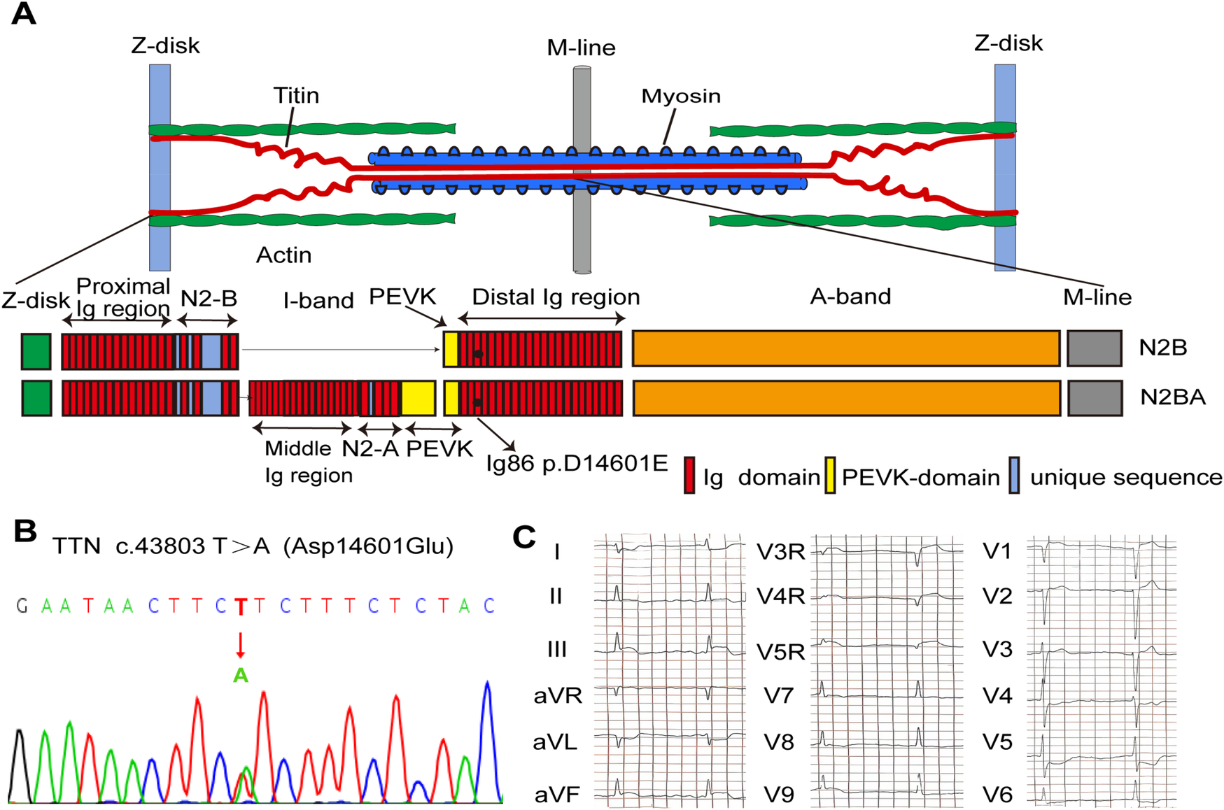 Genetic analysis of the D14601E-titin-positive patient with VF after STEMI. (A) Schematic indicating the main components of the human cardiac sarcomere and the location of titin in the sarcomere. Schematic of two main isoforms of titin (TTN) in the human heart, N2B and N2BA, indicating the location of D14601E variant within the Ig86 region of the I-band. (B) DNA sequencing trace for the D14601E variant identified in TTN. (C) Eighteen-lead ECG before PPCI showing evolving characteristics of inferior and right ventricular STEMI. STEMI, ST-segment elevation myocardial infarction; VF, ventricular fibrillation; Ig, immunoglobulin; ECG, electrocardiogram; PPCI, primary percutaneous coronary intervention.