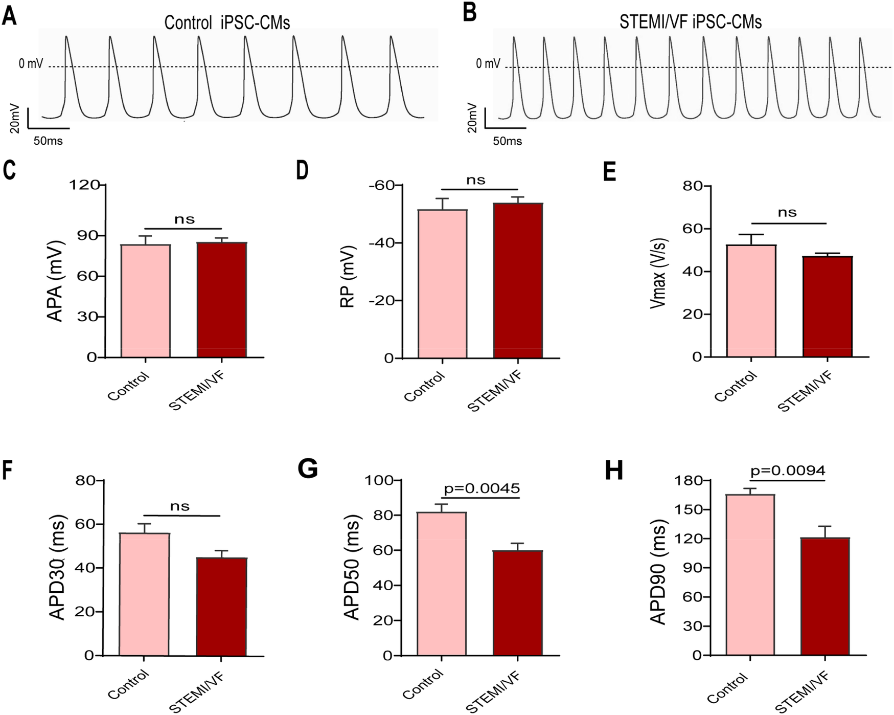 AP traits observed in ventricular-like iPSC-CMs from the STEMI/VF and control groups by single-cell patch clamp. Typical AP traces from the control iPSC-CMs (A) and the STEMI/VF iPSC-CMs (B). The differences between the STEMI/VF and control groups were statistically non-significant for APA (C), RP (D), Vmax(E), and APD30 (F) (P > 0.05). Compared with the control group, APD50 (G) and APD90 (H) were significantly shorter (P < 0.01), n = 5 cells for the control group and n = 6 for the STEMI/VF group. iPSC-CMs, induced pluripotent stem cell-derived cardiomyocytes; STEMI/VF, ventricular fibrillation after ST-segment elevation myocardial infarction; AP, action potential; APA, action potential amplitude; Vmax, maximal upstroke of action potential duration; APD30, APD50, and APD90, action potential duration recorded from beating start to 30%, 50% and 90% repolarization, respectively. Error bars indicate the standard error of the mean. ns, P > 0.05. Student's t-test was used in all figures except for Figure 3E, where Welch's t-test was applied.