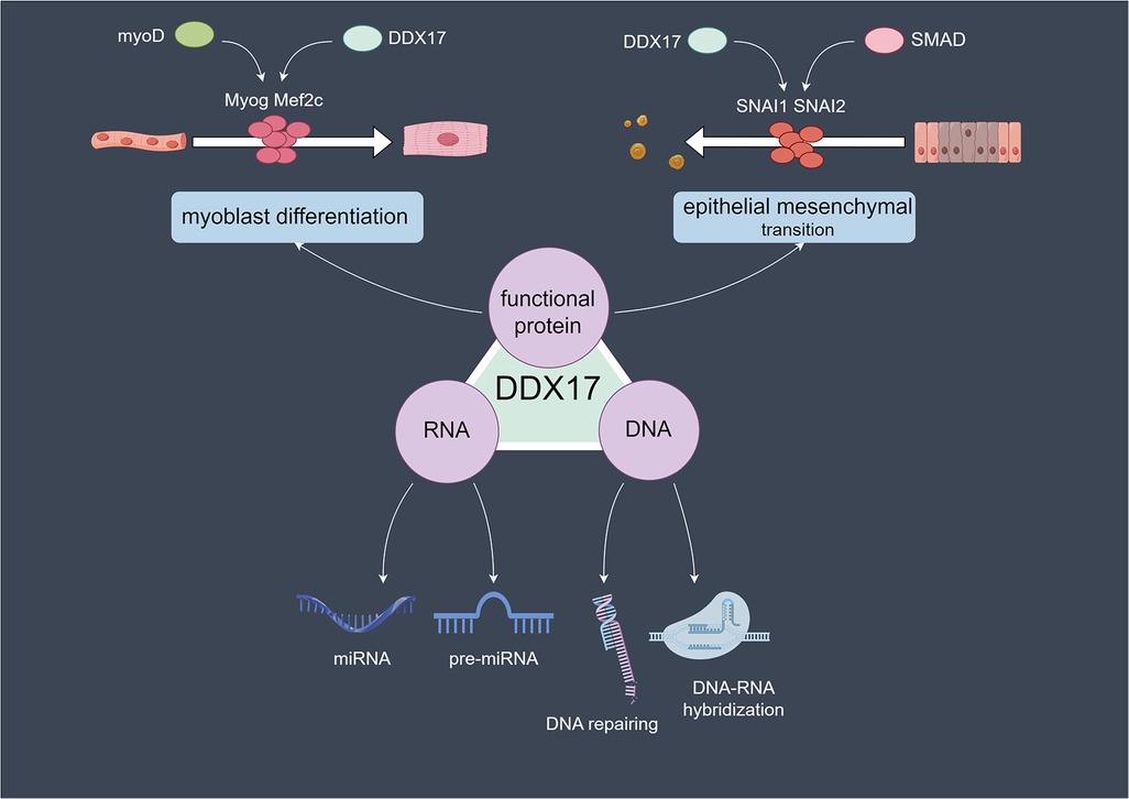 Figure 1. Molecular mechanisms of DDX17 in cellular processes: RNA, DNA, and protein-related functions.DDX17 acts on RNA (processing microRNAs and precursor microRNAs), DNA (repairing DNA and mediating DNA-RNA hybridization), and in protein-related cellular events, such as myoblast differentiation and epithelial-mesenchymal transition.in myoblast differentiation, DDX17 collaborates with myoD, influencing Myog and Mef2c, while in epithelial mesenchymal transition, it partners with SMAD to regulate SNAI1 and SNAI2.